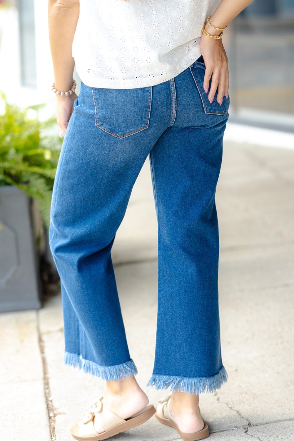 These high-rise cropped wide-leg jeans are sure to be your new go-to’s! The distressed bottom gives these an edgy vibe but they can be dressed up or down with ease for everyday wear! Inseam: 26 inches