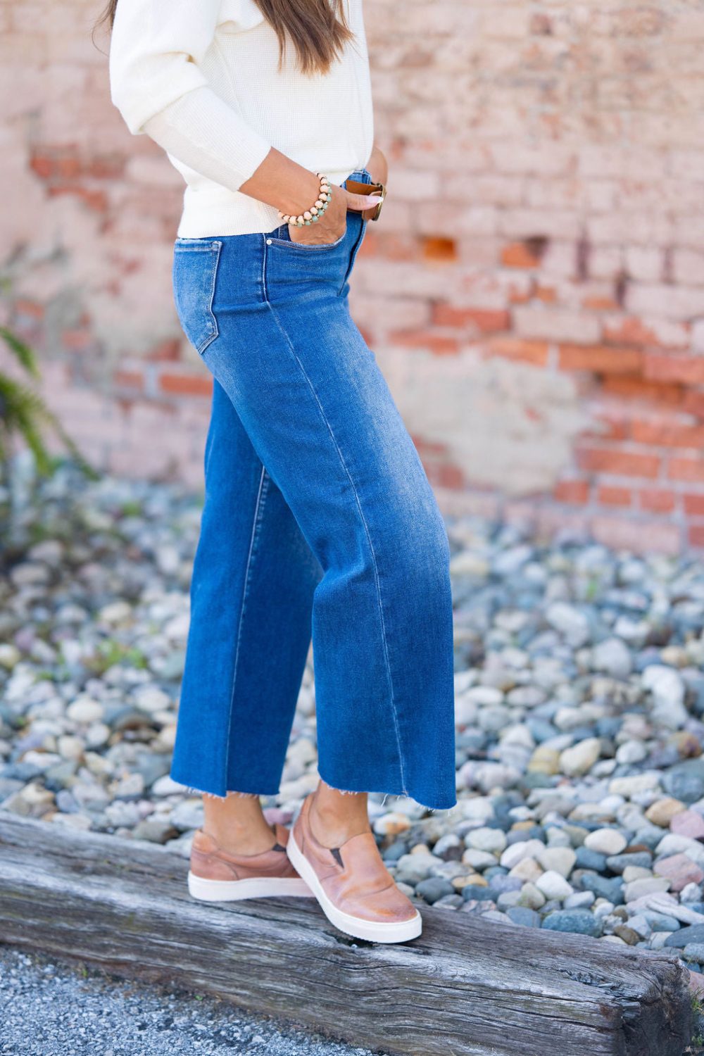 These mid-rise jeans feature a fun cropped wide cuff and the perfect amount of stretch, making them your new go-to’s! Dress these up or down for everyday wear!?