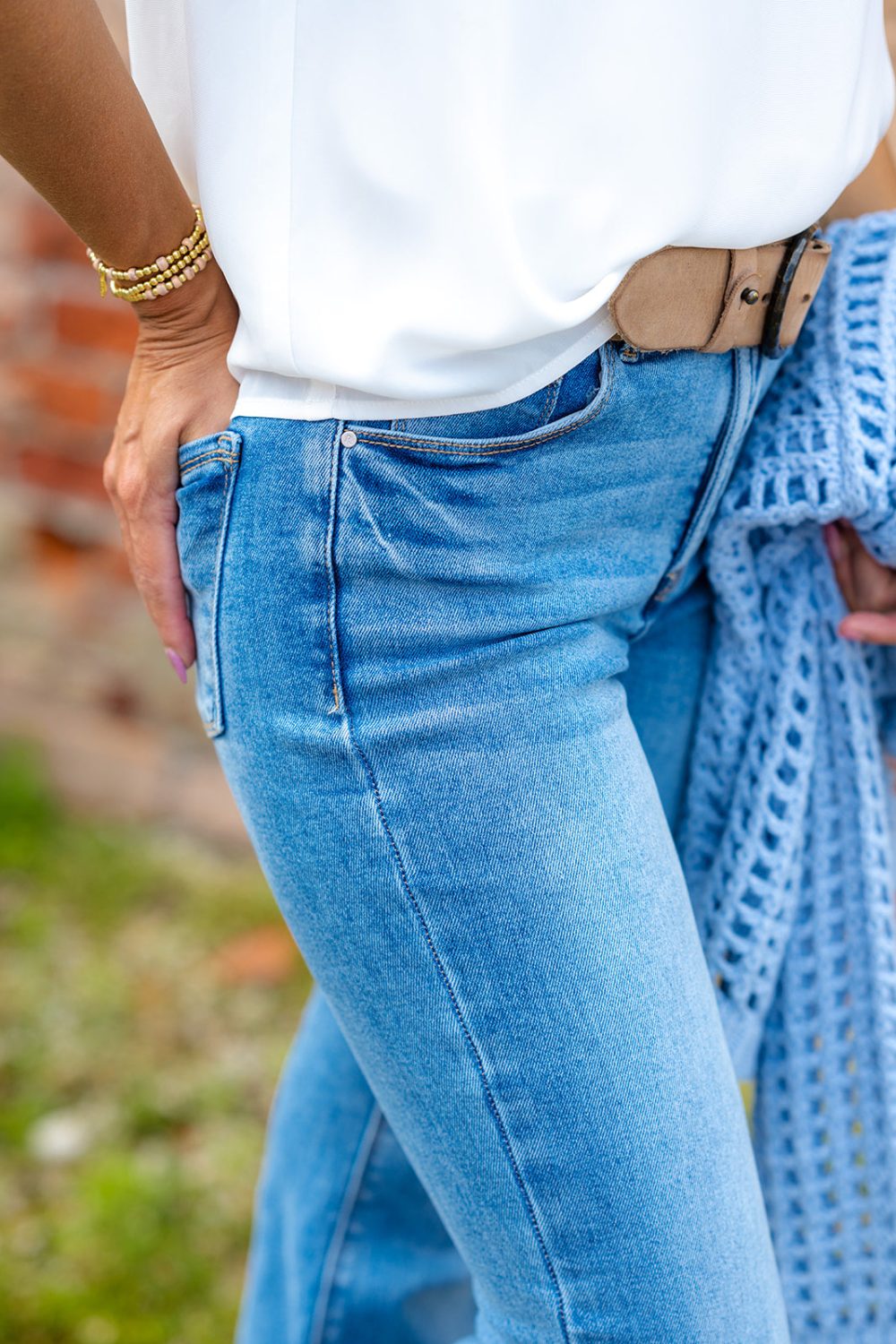 These high-rise cropped jeans feature a wide leg and wide band detailing to set them apart from the rest! Dress these up or down with ease for everyday wear.? 93% Cotton, 5% Polyester, 2% Spandex Inseam: 26 inches